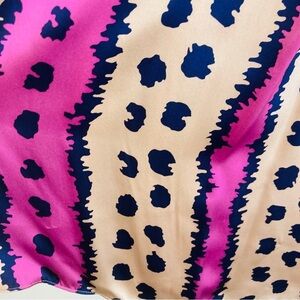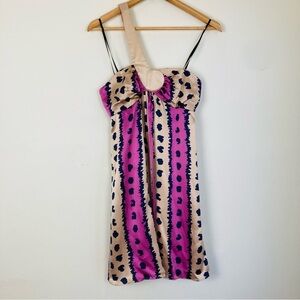 Vintage Y2K 100% silk babydoll maximalist mini dress in bold purple, tan and black print by Laundry. Asymmetric crossover strap. Mini length. New with tags. Size 2