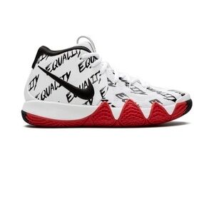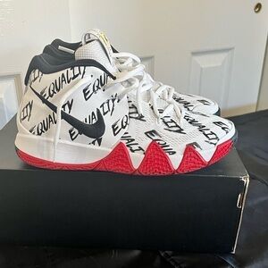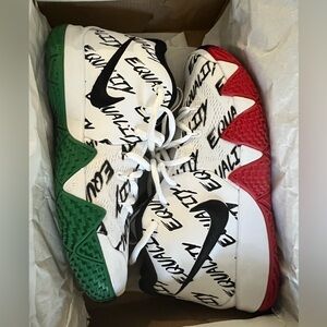 Nike Kyrie 4 Black History Month sneakers, new in box. Youth size 6.5, which is equivalent to a Women's size 8. These “Equality/BHM 2018” shoes are a special edition colorway from February 2018. They feature repeating “Equality” text in black lettering across the upper, white leather, a mesh base, and an embroidered black Swoosh logo. Kyrie’s “KI” insignia is on the tongue. The outsole has red, black, and green stripes, and the liner is black neoprene. Release date: January 15, 2018.