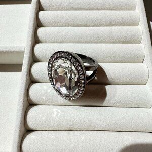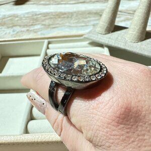 Size 10 Oval-Cut Crystal Statement Ring Hematite Tone Finish & Rhinestone Halo