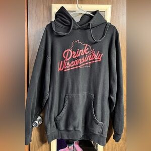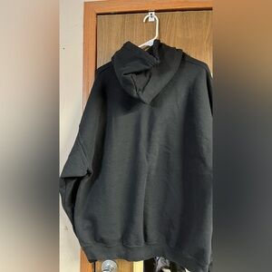 Black hoodie with striking white print. Comfortable and bold design. No defects that I’m aware of! Warm and comfortable!