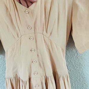 Elegant midi dress with button-down front. Features short sleeves and a tie detail. Stock photos from nowadays styles included. Vintage early 90’s dress which is still duped today. Never worn—I’m a size 0 and it’s just too big to make it work. Good vintage condition, no flaws or stains, gently used. Smoke free home and fast shipper