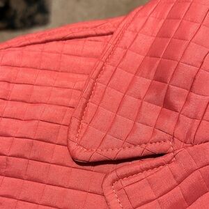 Stylish quilted blazer in coral. Features a classic collar and button front. Perfect for layering.