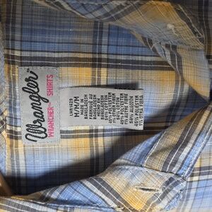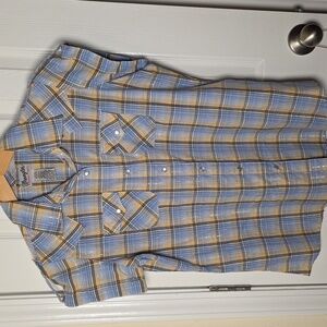 This Wrangler woman's shirt features a stylish blue and yellow plaid pattern with silver metallic threading, pearl snaps, breast pockets, details at shoulder. Perfect for casual outings, it offers comfort and a classic look.