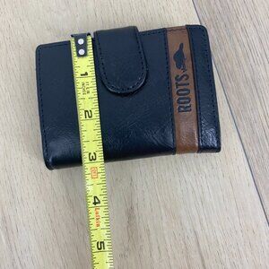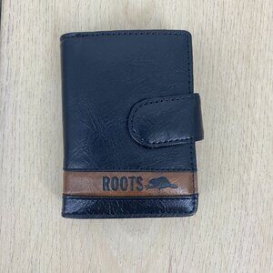 Vintage Roots Leather Bi fold with snap closure, 20 plastic leaf card holder inserts + 6 built in on both interior sides, 2 tone, unisex. Measures 4.25" tall x 3" wide, In excellent condition, like new, no flaws.
