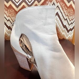 Boot season is here so make sure you're ready with the Free People Wilder Leather Cutout Pointed-Toe Booties! Genuine leather, in a classic cream/off-white hue, shapes these booties that have a pointed-toe upper and an ankle-high shaft and modern western style. Cutouts at the instep and outstep add a unique look to these must-have boots. A pointy toe and side cutout add contemporary finesse to this sleek stacked-heel bootie in white suede.