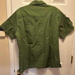 Stylish green short sleeve button-up shirt with multiple pockets. Perfect for casual wear.