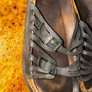 Stylish black strappy sandals with buckle details. Perfect for casual wear.