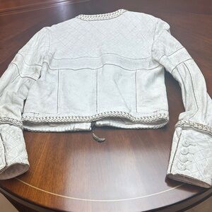 Absolutely stunning Just Cavalli genuine leather jacket, crafted with exquisite attention to detail. This luxury piece features a quilted leather design, elegant braided trim throughout, and a structured silhouette that elevates any outfit.