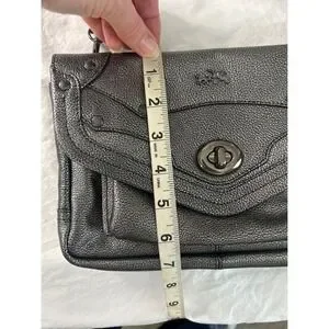 A stylish Coach metallic leather crossbody bag in a versatile pewter color. This bag features a structured flap closure with a signature turnlock hardware and decorative studded accents. The pebbled leather adds a unique texture and durability, making it perfect for everyday use or a night out.