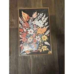Brighten any space with this captivating trio of framed floral wall art. Each print showcases a vibrant bouquet bursting from an ornate vase, rendered in a delightful boho botanical style. The rich black background makes the colorful blossoms and leaves pop, creating a visually stunning focal point. The warm palette of coral, peach, yellow, and muted greens evokes a sense of natural beauty and artistic charm. Perfect for adding a touch of artistic flair to your home.