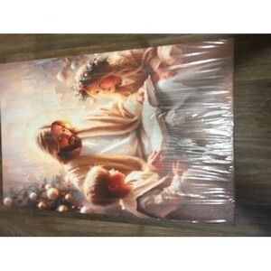 Inspiring artwork depicts Jesus Christ tenderly holding a child, surrounded by angels and a halo of light. This piece captures a moment of divine love and protection, bringing a sense of peace and spirituality to any space. The vibrant colors and detailed rendering create a captivating visual that resonates deeply. Perfect for a sanctuary, living room, or nursery, this canvas print offers a daily reminder of faith and comfort.
