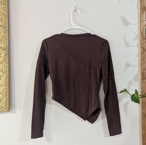 Never worn! Really cool diagonal seams and an asymmetrical bandana hemline. Long sleeve, crew neck. A little bit of stretch -- would be best for a small or extra small. Please see pic for measurements.