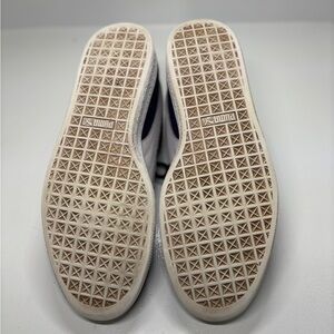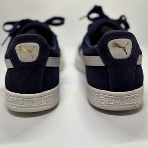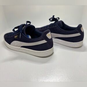 Classic Puma sneakers in dark blue. White accents for a stylish look. Perfect for casual outings. These are in great shape with a few scuffs here and there. See photos for details. Feel free to request more information or make me an offer.