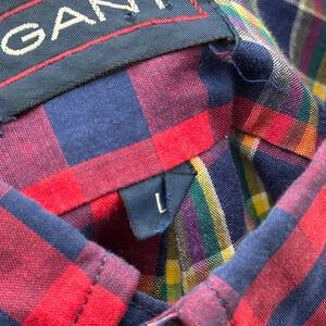 This vintage Gant shirt for men in size L features a blue and red plaid pattern with a collared neckline and button-down closure. The long-sleeved shirt is made of a comfortable cotton blend fabric with a woven texture. It has a regular fit and a button-down collar style.
