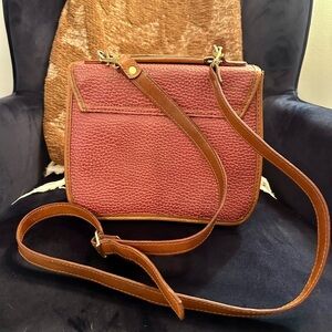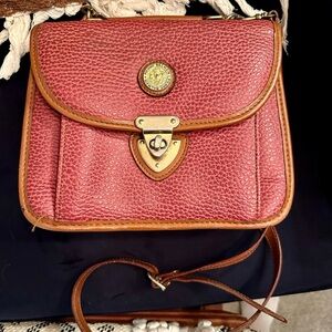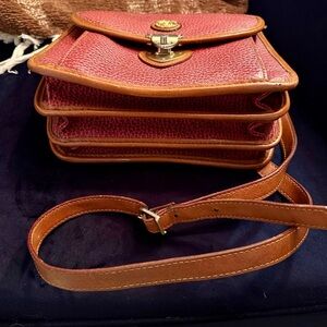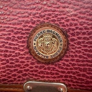 This is a vintage Pierre Balmain red pebbled leather crossbody bag with tan trim and brass hardware