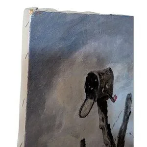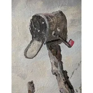 A humorous depiction of a rustic mailbox resembling an animal with an open mouth, this 1972 W.T. Zivic signed painting offers unique charm, quirky, and whimsey. Original oil painting on canvas.