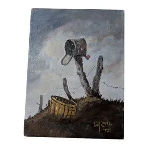 W.T. Zivic 1972 Original Oil Painting Mailbox Animal Design Moody Country Signed