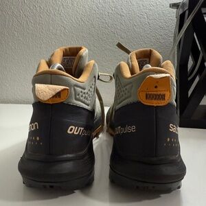 Light green and black Salomon athletic shoes. Perfect for trail running. Durable and stylish design.