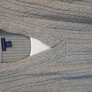Beautiful Women's Size XL Karen Scott Classic V-neck light gray sweater with cable knit design. Has a layered look. Soft and comfortable. Heavier sweater for those cooler temperature outings. Ideal for layering! Pre Owned. Gently Used. IF ANY. Looks New. Great addition to a closet.