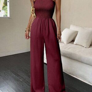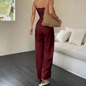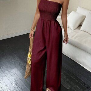 Burgundy Casual Women's Sexy Pleated Off-Shoulder Sleeveless Jumpsuit
