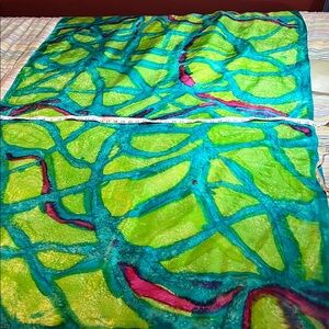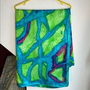 Bright green and blue scarf with abstract patterns. Hand rolled hems. Perfect for adding a pop of color.