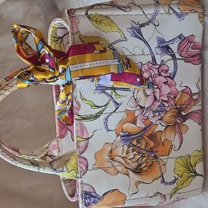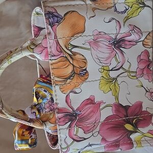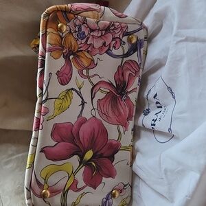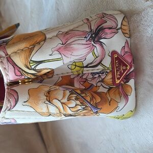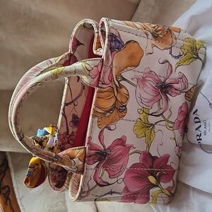 Chic Prada tote with vibrant floral design. Perfect for any occasion. Stylish and elegant.