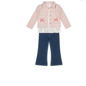 Add a touch of charm and sparkle to her wardrobe with the Little Lass Toddler Girls 3-Piece Jacket Set, perfect for stylish everyday wear or special occasions. This adorable ensemble features a novelty tweed jacket adorned with velvet ribbon bows on two patch pockets, a button-front closure, and a hint of shimmer from the lurex threads—fully lined for comfort and warmth. The coordinating long sleeve knit tee is sweetly detailed with a tacked bow at the neckline, a delicate chiffon ruffle hem, and a back button closure for easy dressing. Completing the look is a comfy knit denim pull-on pant with an elastic waistband, ensuring all-day play-ready comfort with effortless style.