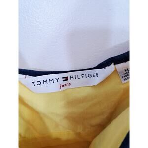 The Tommy Hilfiger Women's Vintage 2002 Shelf Bra Tank Top in Yellow, Size XL is a stylish and comfortable sleeveless top perfect for casual occasions. Made from a blend of spandex and cotton, this pullover tank features a solid pattern with the iconic Tommy Hilfiger logo accent. The built-in bra and stretch material make it a practical choice for the summer, fall, and spring seasons. With its Y2K theme and vintage design, this tank adds a touch of retro flair to any outfit. This is in used condition, the staps are a bit worn and not adjustable. It measures 17" from armpit to armpit and 22" from shoulder to hem.