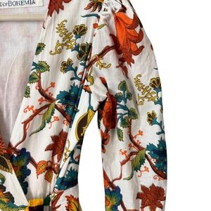 Stunning Alix of Bohemia Lalli Reef wrap maxi dress featuring a vibrant, artisan-inspired floral print, flattering true wrap silhouette, deep V neckline, long sleeves, and an asymmetrical hem with fringe detail. Crafted from lightweight cotton with the brand's signature handcrafted, global aesthetic.