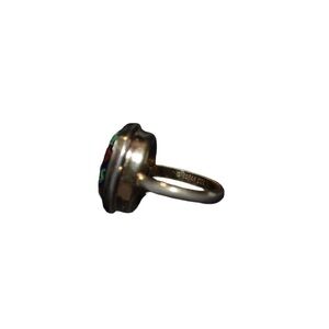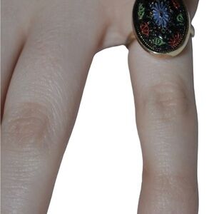 Sz. 5 signed Sarah Coventry vintage costume ring, “Light of the East” from the 1970’s. Gold tone, hand painted. Please see the picture with the ring on the sizer, showing the silver color on the bottom of the band, adding to the vintage charm. The top of the ring measures approximately 3/4” long and 1/2” wide.
