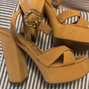 Worn once for a wedding. Great condition, some grass stains on the platform (shown in photo). Gorgeous mustard color