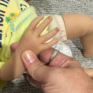 Realistic baby doll wearing a yellow 'Beach Trip' shirt. Perfect for playtime.