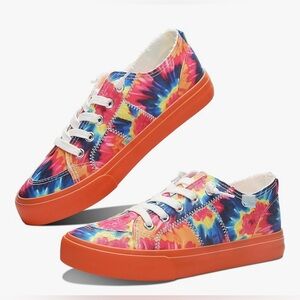 Vibrant tie-dye sneakers featuring orange soles. Perfect for a bold look. New women’s US size 5 Eye catching stunning, unique and fun tie-dyed lace up classic tennis sneaker. Please note sizing in photos.