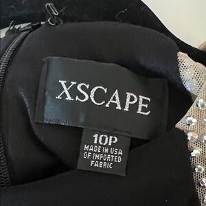 Chic black maxi gown by Xscape. Features shimmering rhinestone details on sleeves and sides.