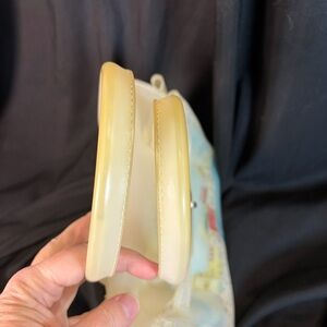 Charming Capri City™ novelty handbag made in Italy, featuring a whimsical Italian coastal town illustration with boats, buildings, and seaside details. Structured top-handle silhouette with a turn-lock closure and translucent cream vinyl body.