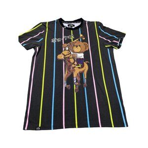 R.SINE Shirt Men Large Black Striped Bear Polo Graphic Tee Streetwear Casual Y2K