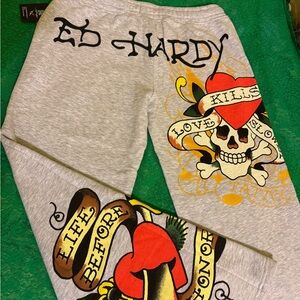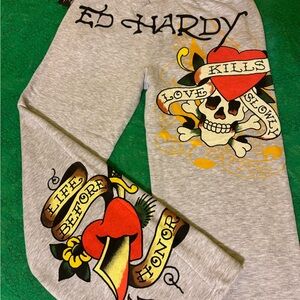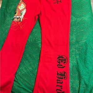 Striking red sweatpants with eye-catching graphics. Signature Ed Hardy style.