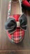Chic red plaid loafers with a bold black/diamond edges bow. Embellished with sparkling accents. Perfect for a stylish look. Worn once. In excellent condition.