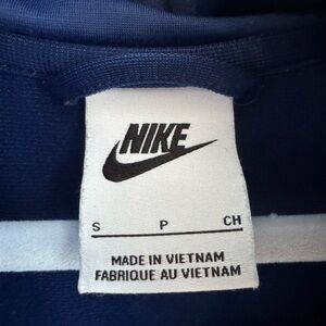Royal blue jogger pants and jacket set with elastic cuffs. White Nike logo on leg, chest, and back. Perfect for sports and play. Very nice condition! This is marked as a boys small and equivalent to a boys 8/9