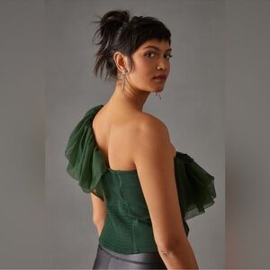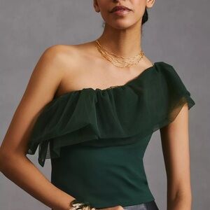 Anthropologie Sunday in Brooklyn Forest Green Asymmetrical Tulle Ruffle Top M