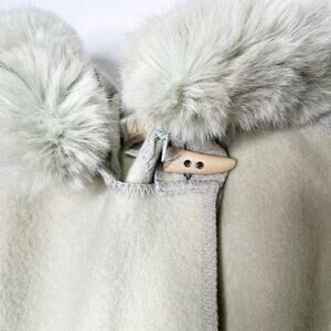 Amazing statement piece! Fur cuffs are removable via Velcro. Fur lined hood is zippered on. Genuine horn buckle at the neck. Thoughtful iridescent buttons for tabs. Removable shoulder pads. Two pickets. Single button front + collar toggle. Beautiful eagle embroidery. Gentle green colorway. Blanket stitching.