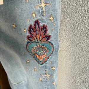 NWT, gorgeous Driftwood jeans. Chic wide leg barrel jeans with colorful embroidery. Ideal for a stylish casual look. Absolutely in love with the embroidery, very cool! These jeans run big. I ordered them for myself during a time they were moving warehouses and were not taking returns, needless to say they did not fit me. My loss is your gain.