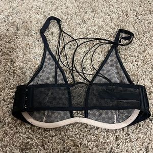 Elegant black lace bra with intricate design. Features delicate straps and supportive fit.