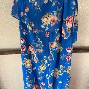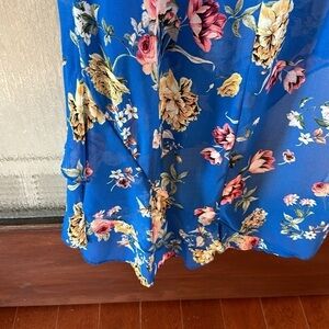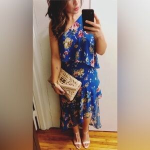 Blue floral printed chiffon (100% Polyester). Maxi. Sleeveless. One shoulder neckline. Hidden back zipper. Partially lined. 38" from shoulder to shortest hemline, 55" from shoulder to longest hemline. Made in the USA.