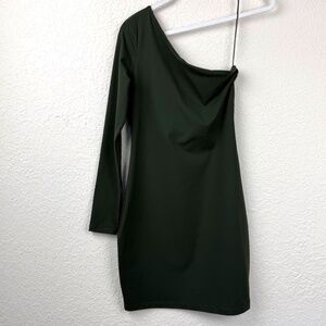 This mini dress features a sleek, figure-hugging silhouette, one long sleeve, and an asymmetric neckline.