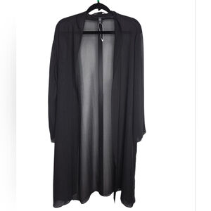 SEO Keywords: Eileen Fisher silk georgette jacket, sheer black high collar jacket, petite silk long jacket, minimalist open front topper, EF sheer layering piece, luxury silk cardigan