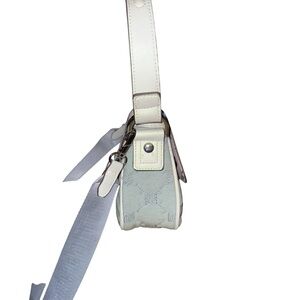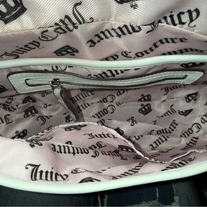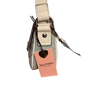 NWT. Light blue denim with embroidered logo. White faux leather trim. Fold over flap with silver rhinestone Juicy logo. Top carry handle and a detachable light blue canvas adjustable guitar crossbody strap. Removable coin pouch. Silver hardware. Inside has a pink printed liner, side zippered pocket and slip pockets. 12” wide x 6.5” high x 3” deep x 7.5” strap gap. * on the front of the bad is a small mark. Not sure from what (see pic) and a tiny nick on the one side (see pic).