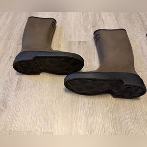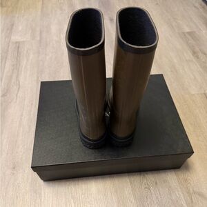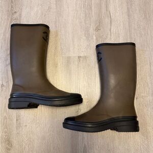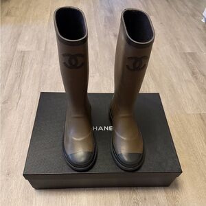 Elegant CHANEL rain boots in olive and black. Ideal for wet weather.