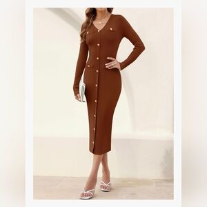 •Features: open front button, v-neck, split hem, soild color, ribbed knit sweater dress, long sleeve, bodycon sweater dress, below knee length, 2025 fall winter trendy dresses, causal dress, slim fit sweater dress, elegant midi long dress.