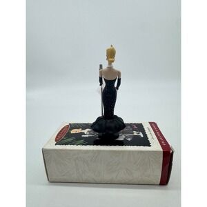 A delightful Hallmark Keepsake Ornament depicting Barbie as 'Solo in the Spotlight.' This 1995 edition captures Barbie in a glamorous black evening gown, complete with a sparkling overlay and a dramatic ruffled hem, holding a microphone. As the second in the Barbie Collector Series, this ornament celebrates iconic Barbie styles from 1960 to 1964, making it a perfect addition to holiday decorations or a collector's display.